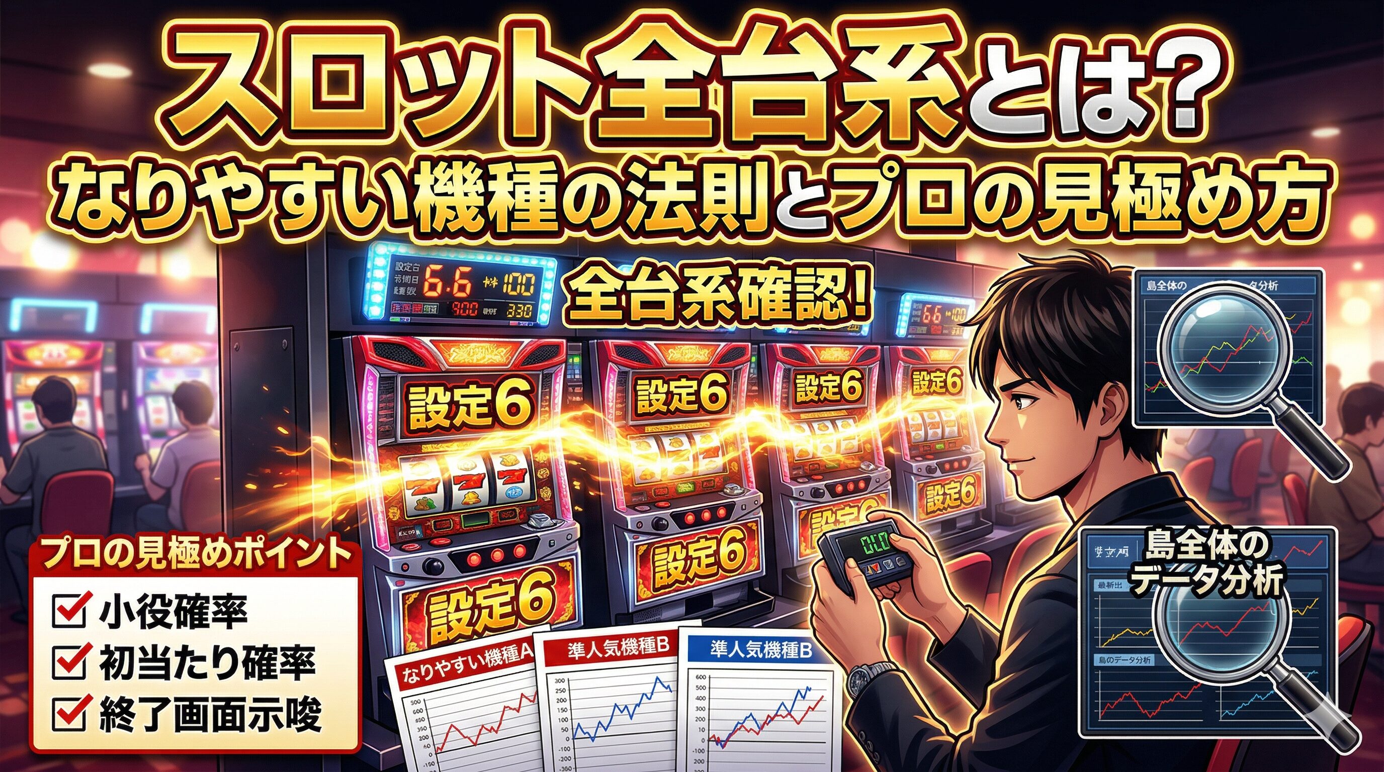 この記事では、スロットの「全台系」の基本的な意味から、店側の思惑から逆算する「全台系になりやすい機種」の法則、そして最も重要な**「設定④の罠を回避し、現場の挙動から本物を見極めるプロのポイント」**までを完全解説します。